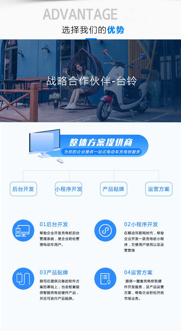 動(dòng)車、智能充電樁、智能充電柜、電動(dòng)車銷售與售后平臺(tái),致力于打造一套完整的電動(dòng)車生態(tài)圈,為客戶提供電動(dòng)車從購買到使用、充換電及售后乖全方位的產(chǎn)品體驗(yàn)。